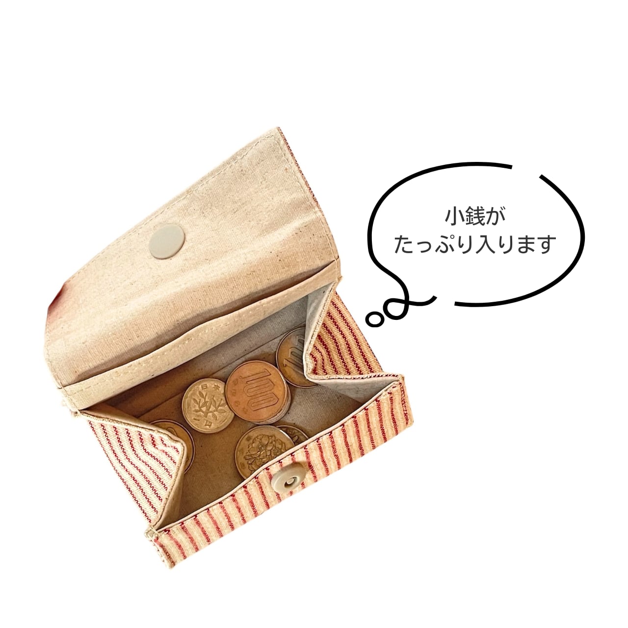ガバっと開いて、小銭が見やすく取り出しやすい小銭入れです。